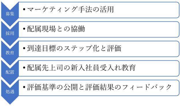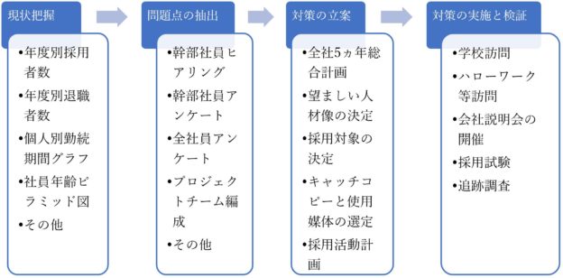 当社では、①募集、②採用、③教育、④配置、⑤処遇の5段階について、貴社の現状把握、問題点の抽出、最も重要な課題についてその解決策を考え、実行できるようご支援します。各段階でのポイントは下図のとおりです。