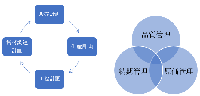 ①販売計画、②生産計画、③工程計画、④資材調達計画の4つの側面から工場の仕事の流れを分析し、その会社に必要かつ十分な①品質管理、②原価管理、③在庫管理ができるようなしくみを考えます。