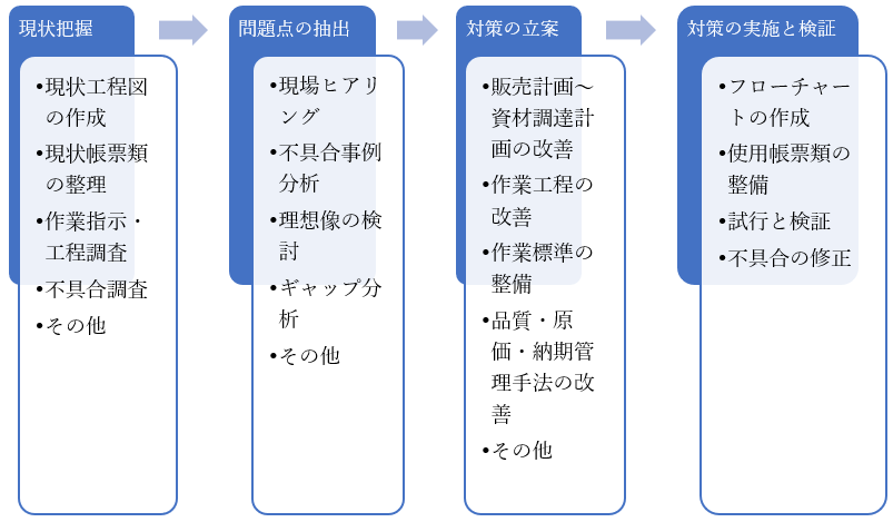 教科書に書いてある一般的な生産管理のやり方を「あるべき姿」として考えるのではなく、貴社で現在実施している生産管理のやり方を出発点として、貴社が目指している品質・原価・納期を実現するためのしくみをご提案いたします。